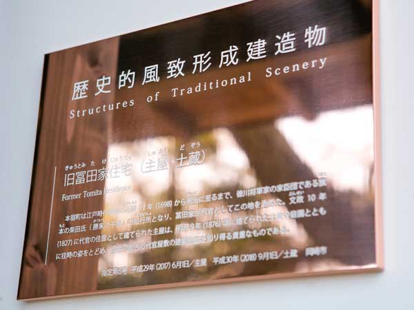 在地の武士住宅の遺構となる冨田家の旧主屋は、平面が農家の六間取りに近いですが土間が狭く、矩折れに接客空間を設ける空間が往時のこの地域における住宅建築の技術的、様式的な指標ともなっています。なお、この建物は2017年に岡崎市より歴史的風致形成建造物に指定されました。 みなさま、この歴史的に価値がある建造物である冨田家旧主屋にお越しくださり、江戸時代から続く歴史の滔々とした流れをお感じくださいませ。
